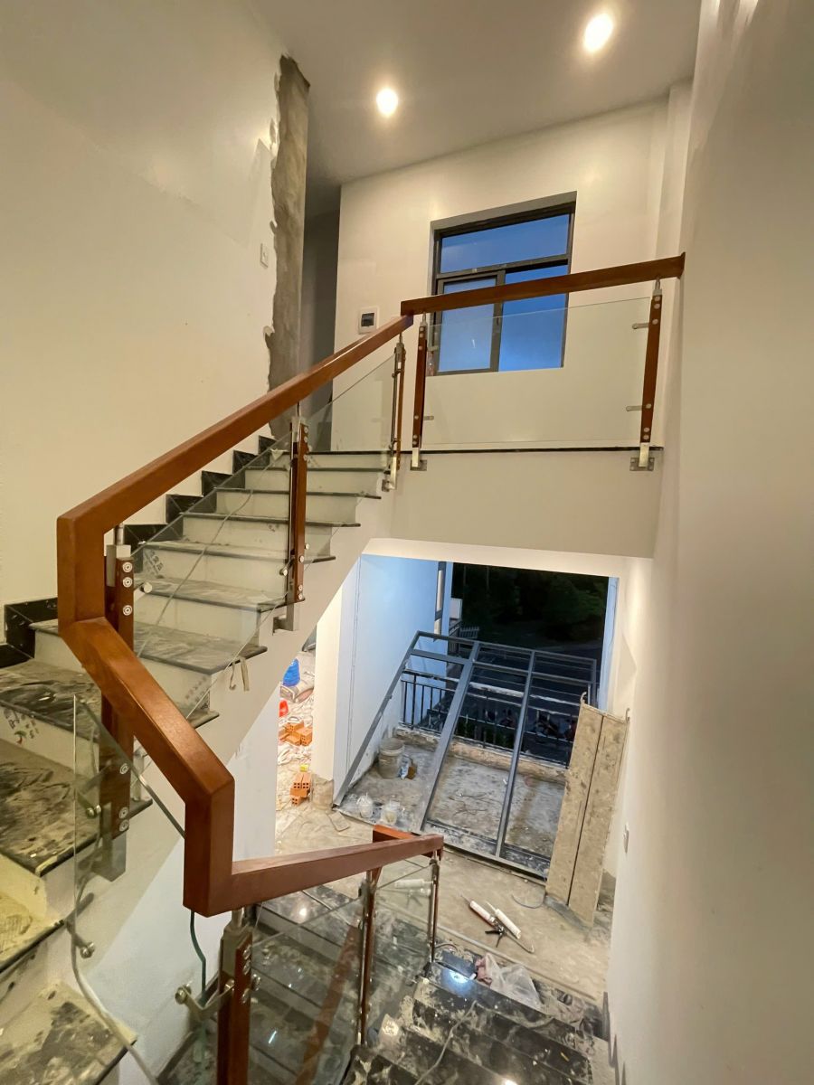 Lan can kính tay vịn gỗ vuông có tính thẩm mỹ cao