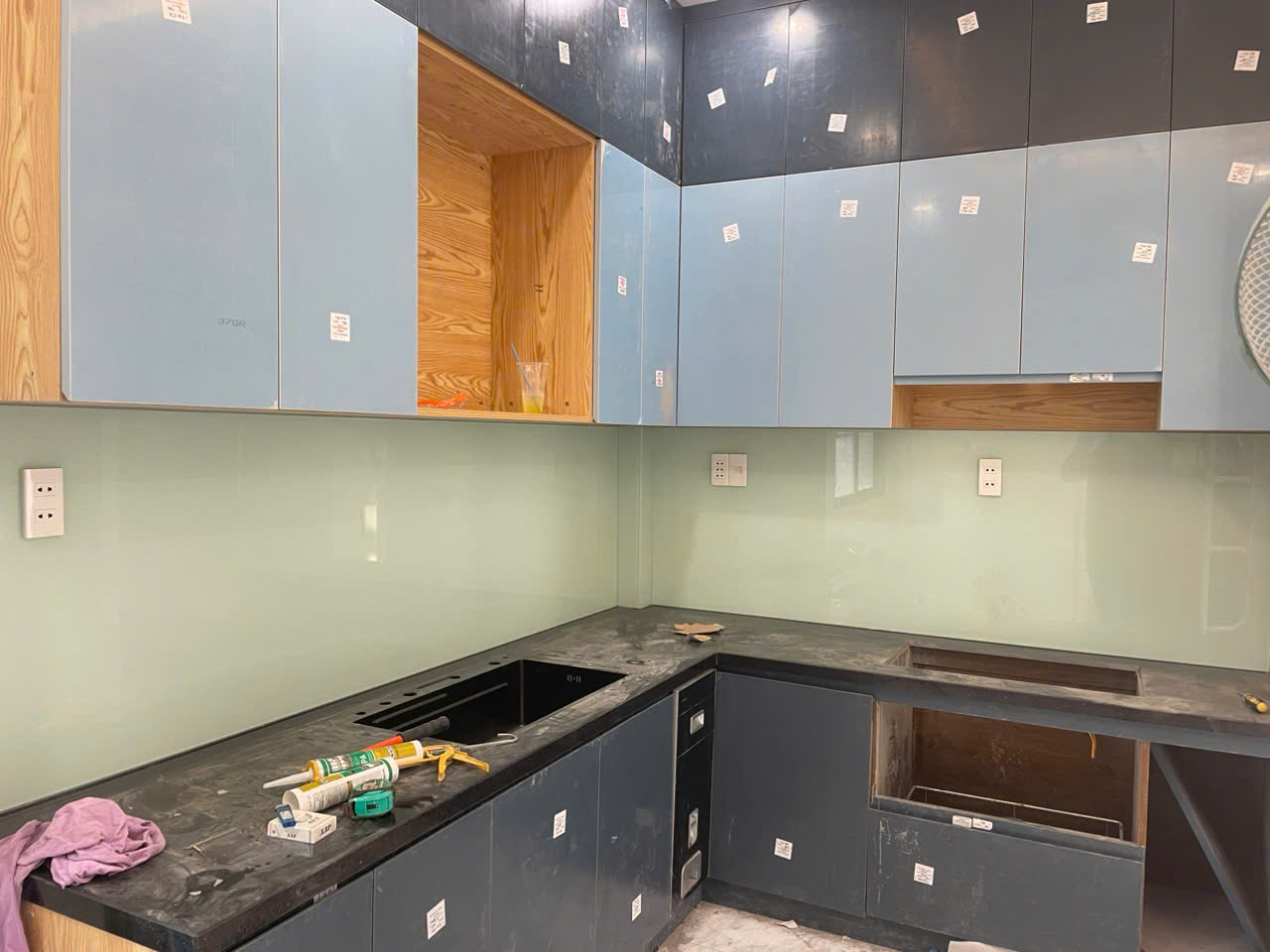 Kính là thành phần lắp sau cùng, sau khi lắp đặt tủ bếp, khoét lỗ ổ cắm điện, móc treo dao thớt… thì mới đến công đoạn đo đạc, xác định kích thước cho kính ốp bếp. Bạn không phải lo vấn đề trên vì đây là hàng may đo, yêu cầu sẽ do bạn đưa ra, kích thước & kỹ thuật do thợ xử lý.